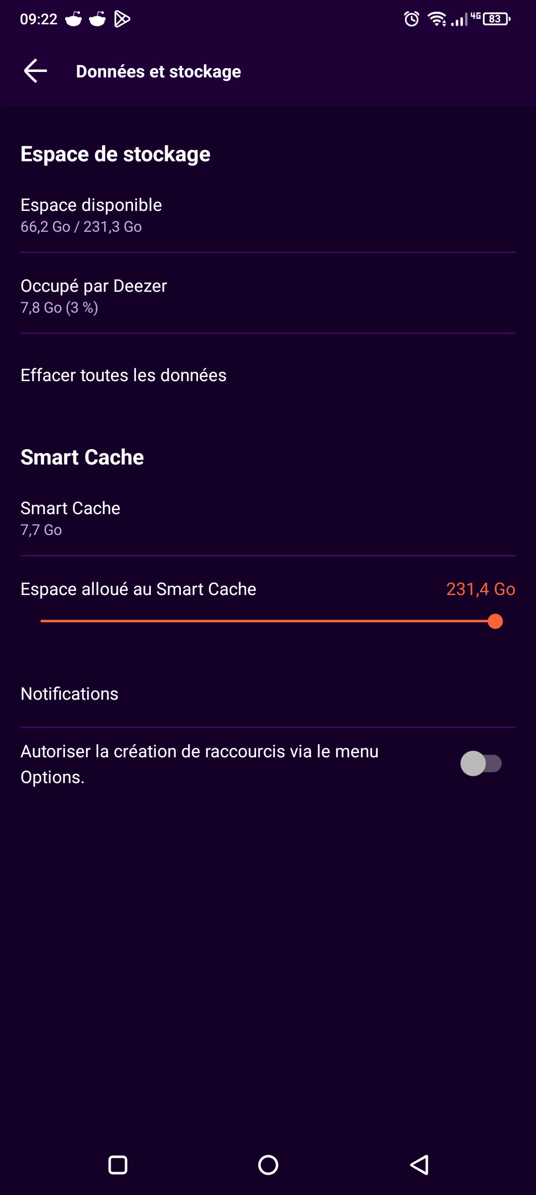 Bon, pour le smart cache, il faudra effacer toutes les données comme indiqué ici (supprimera les téléchargements mais pas ton contenu musical) :