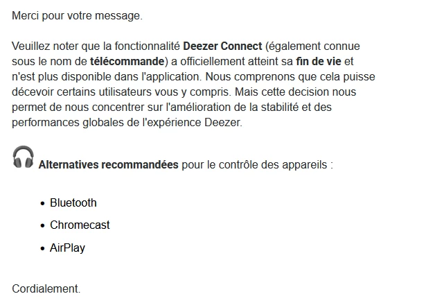 Après avoir contacté le support en remarquant que Deezer Connect n’était plus disponible (sur pc et android), j’ai eu un premier retour.