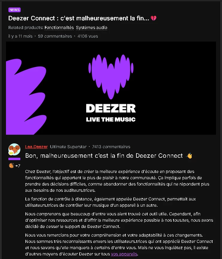 Bonjour , J’aimerai savoir en quoi sa vous aide en quoi d’enlever le Deezer connect ? Car sur ce screen , on voit que vous avez écrit “Chez Deezer, l’objectif est de créer la meilleure expérience d'écoute en proposant des fonctionnalités qui apportent le plus de plaisir à notre communauté. Ça implique parfois de prendre des décisions difficiles, comme abandonner des fonctionnalités qui ne répondent plus aux besoins de nos auditeurs.trices.” mais ducoup pourquoi vous aurez bien plus le laissez nan ?