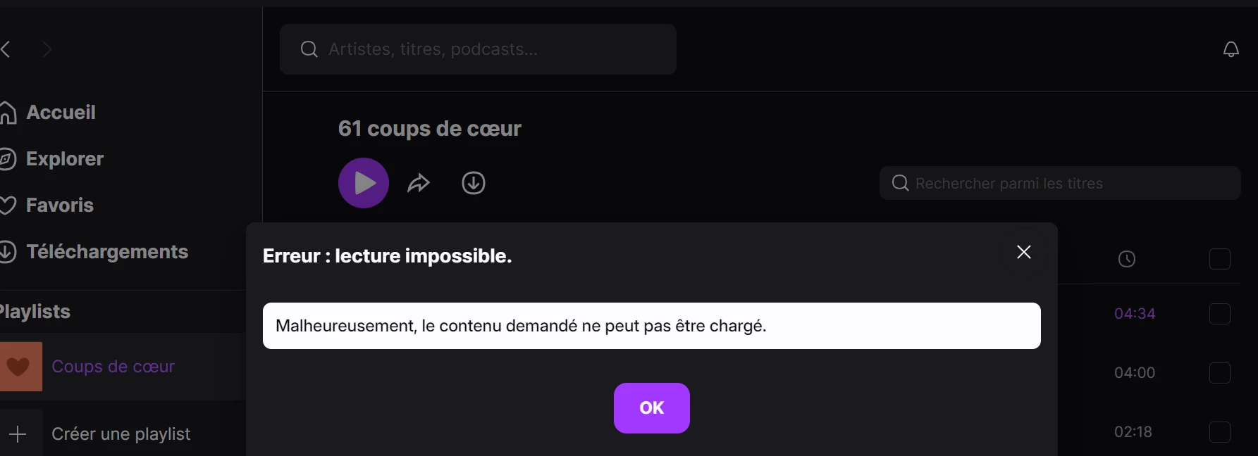 “Malheureusement, le contenu demandé ne peut pas être chargé.” Je peux rien écoutet, que ce soit sur mes coup de coeur ou autres.