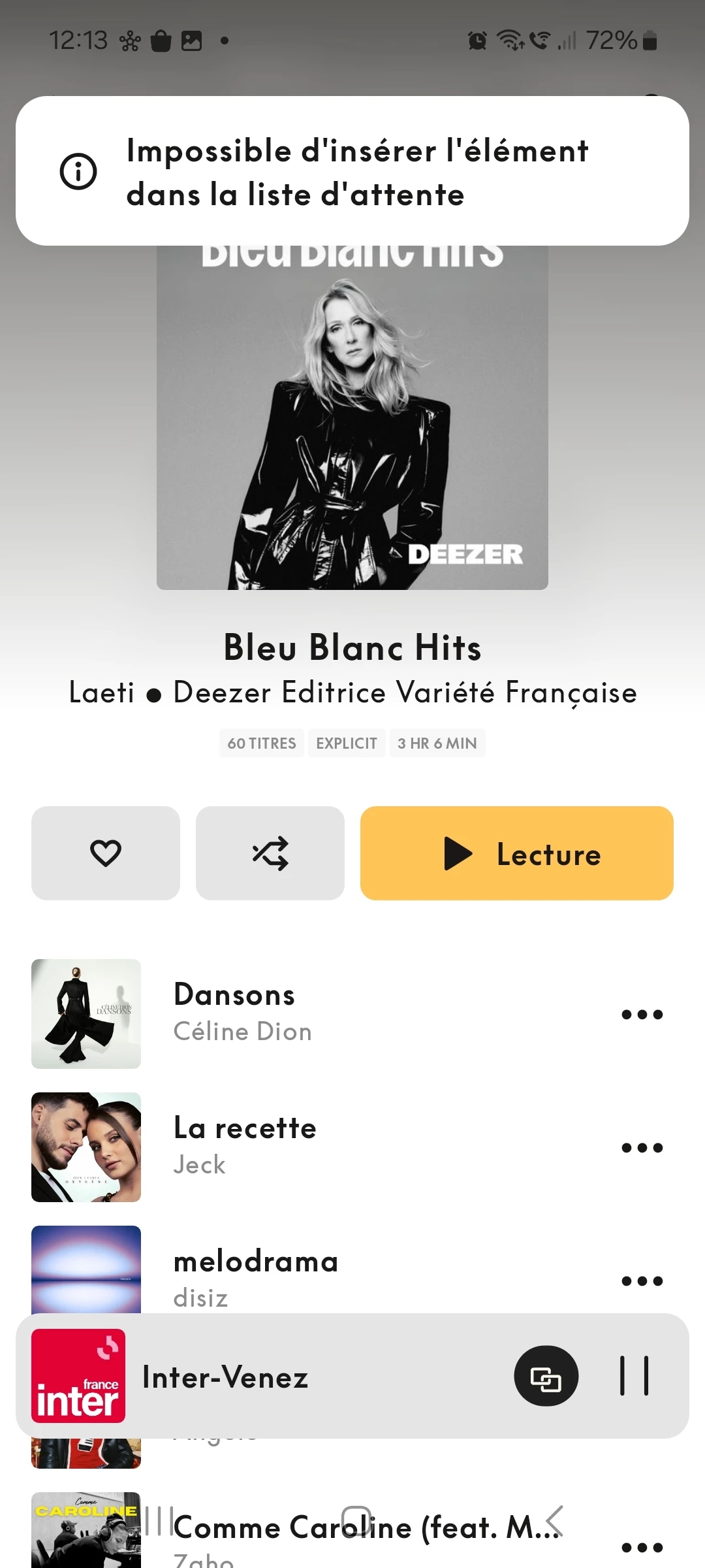 Le message qui apparait dans la fenêtre deezer au sein de l application lorsque j essaye de lancer une chanson est " impossible d insérer l élément dans la file d attente ". J ai suivi les conseils de bang et olufsen en desinstalant l application mais rien ne change.