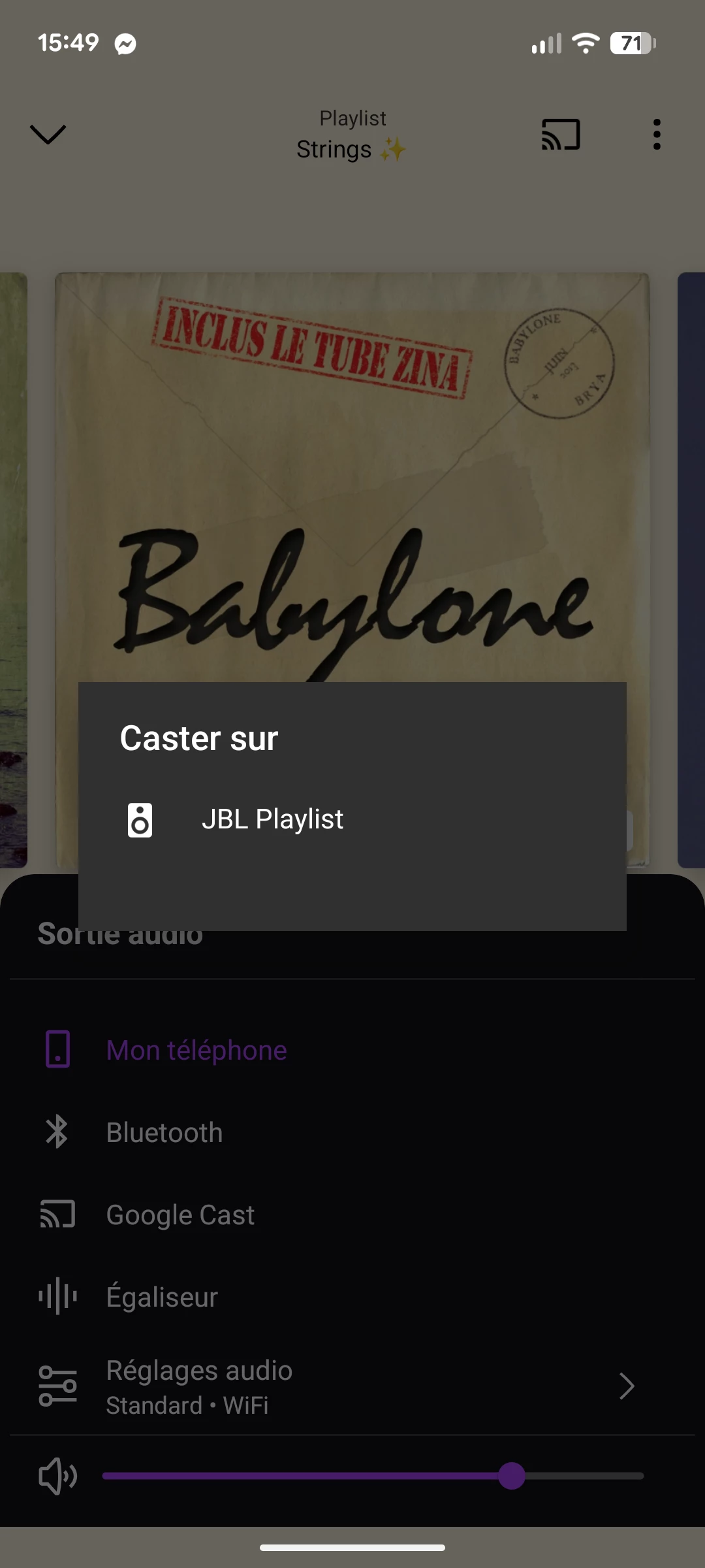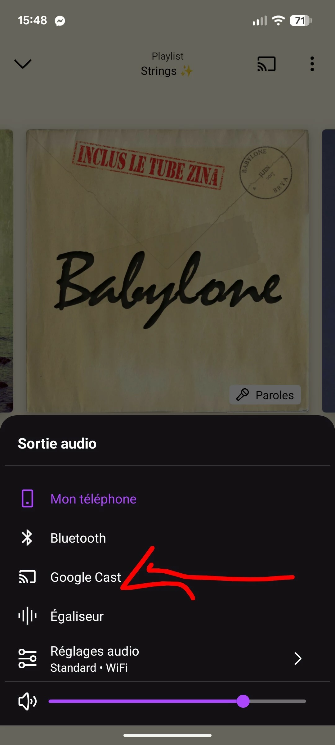 - je cast via Google Home sur une enceinte connectée (JBL PLAYLIST)