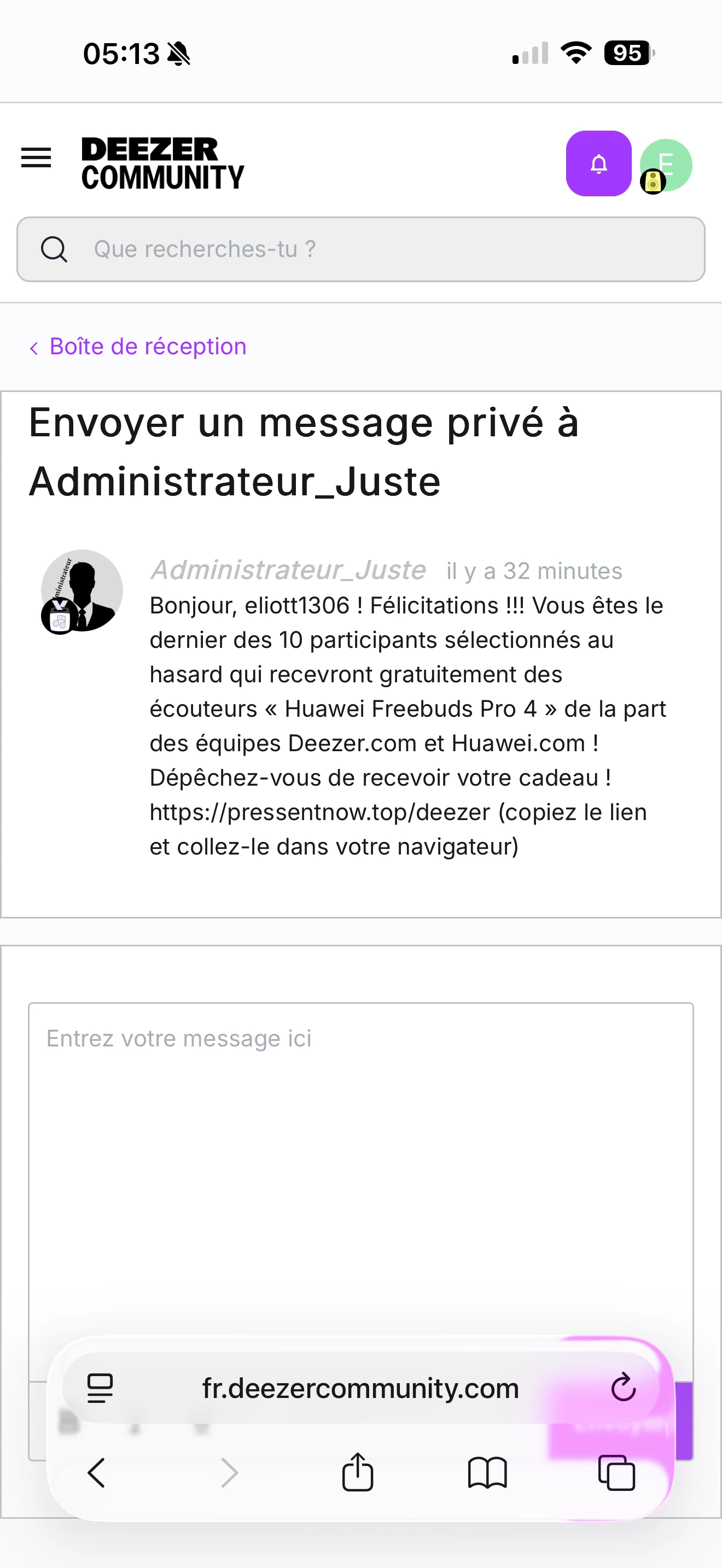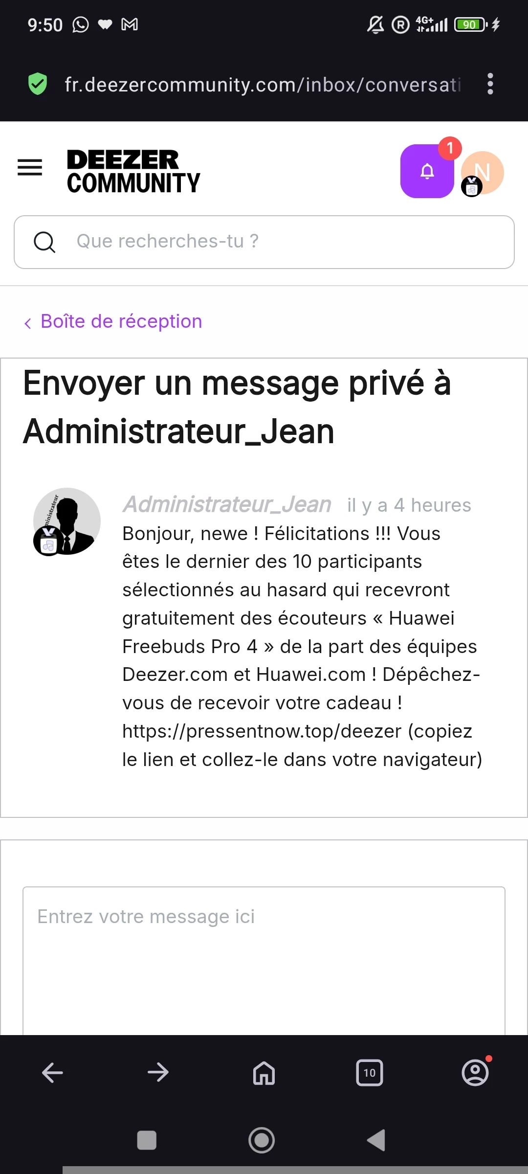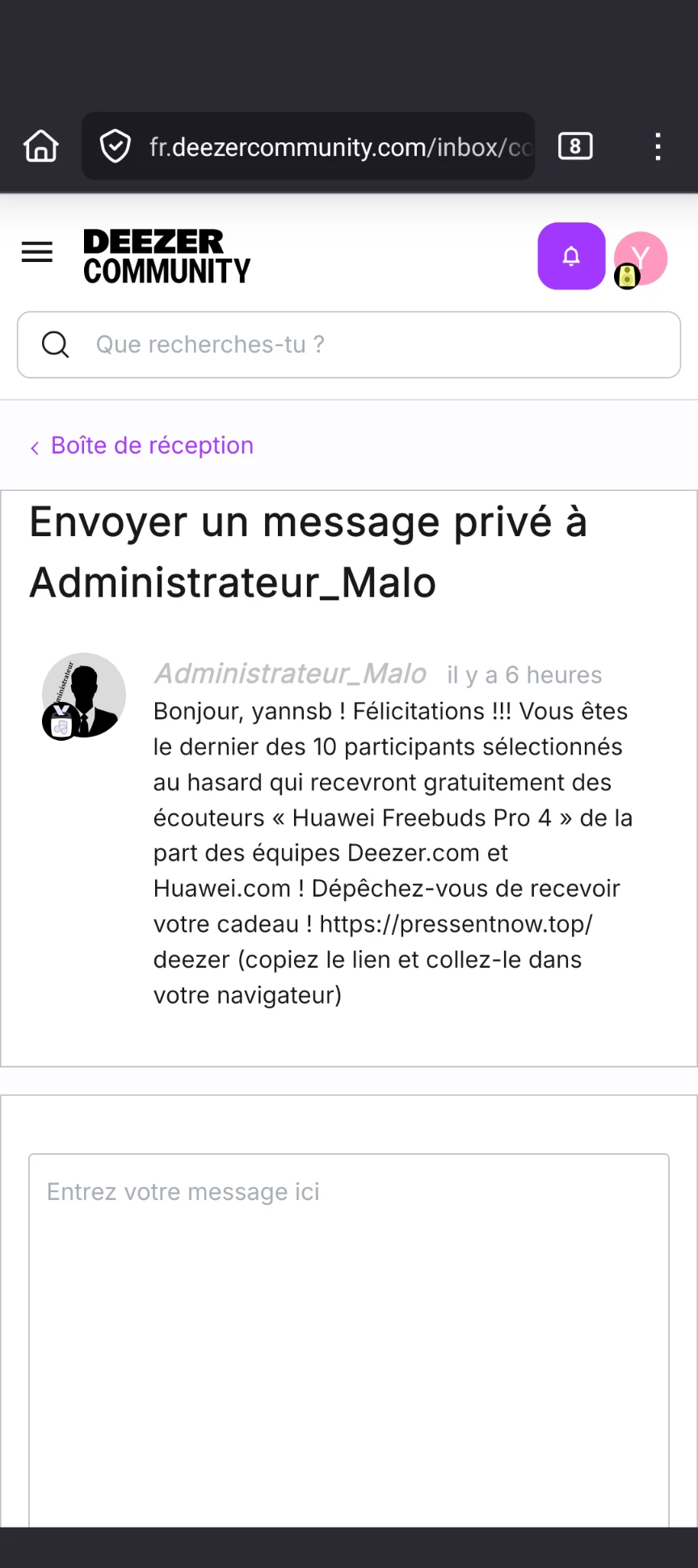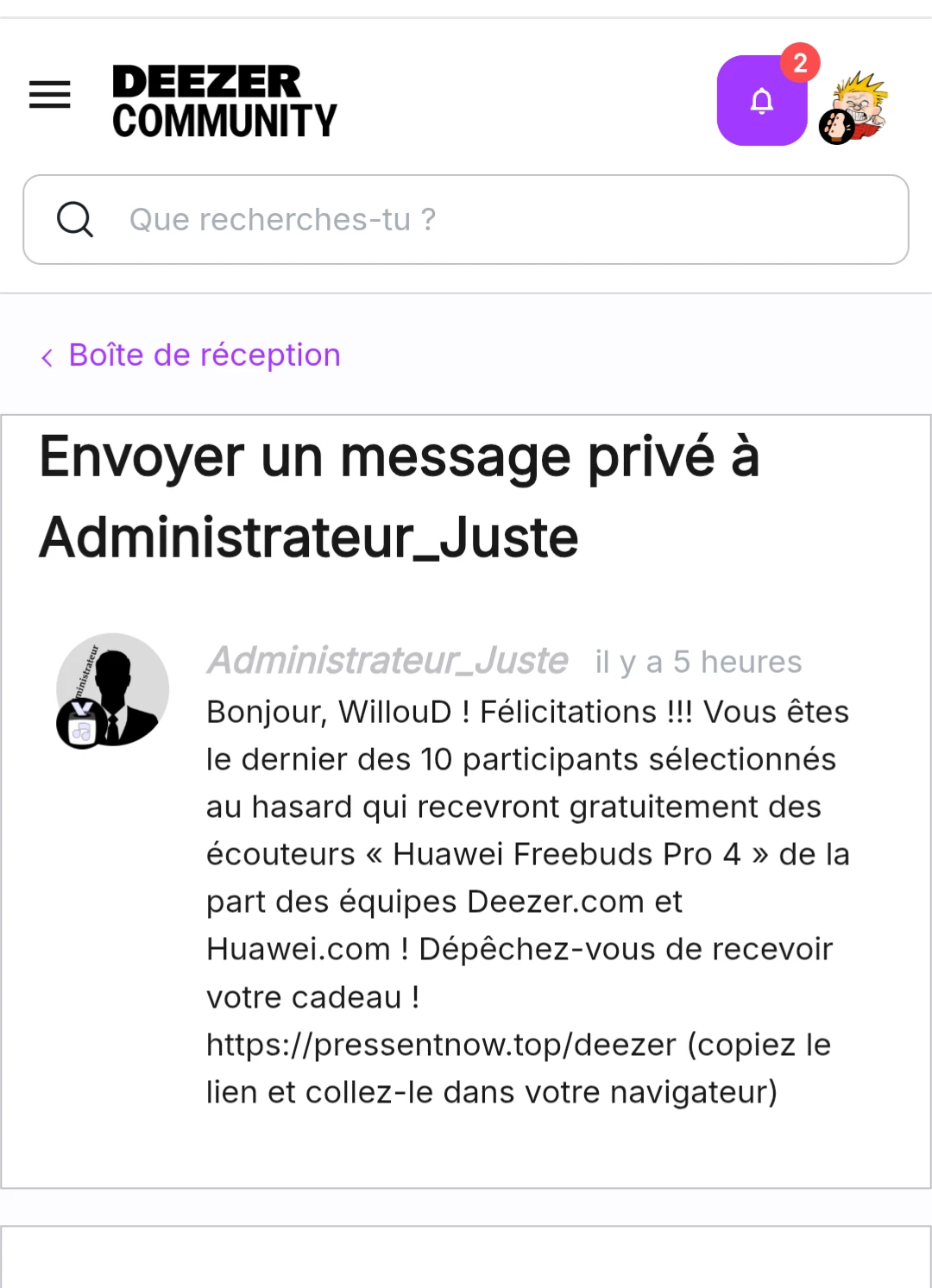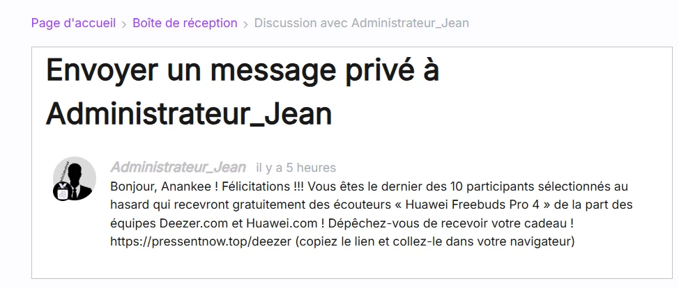 Bonjour, Alexim ! Félicitations !!! Vous êtes le dernier des 10 participants sélectionnés au hasard qui recevront gratuitement des écouteurs « Huawei Freebuds Pro 4 » de la part des équipes Deezer.com et Huawei.com ! Dépêchez-vous de recevoir votre cadeau ! {Url-de-l-arnaque} (copiez le lien et collez-le dans votre navigateur "