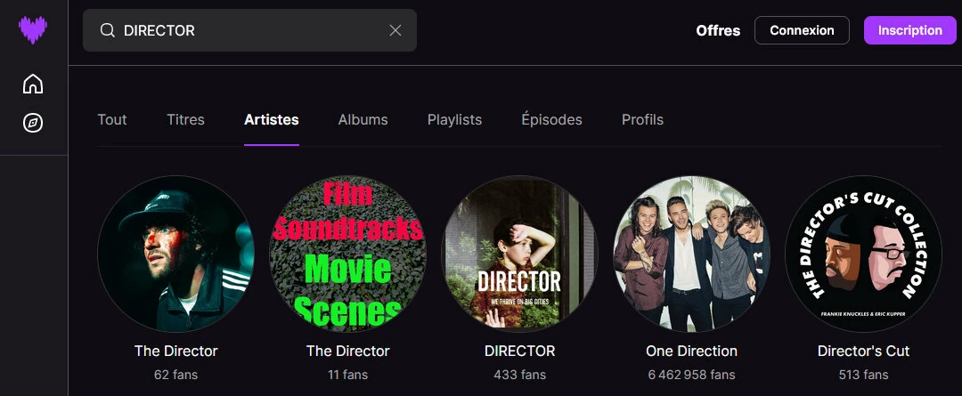 je cherche la discographie du groupe DIRECTOR , je tape le nom exactement dans la bonne orthographe et la bonne casse : et bam, Deezer trouve le moyen de suggérer d’autres artistes avant!