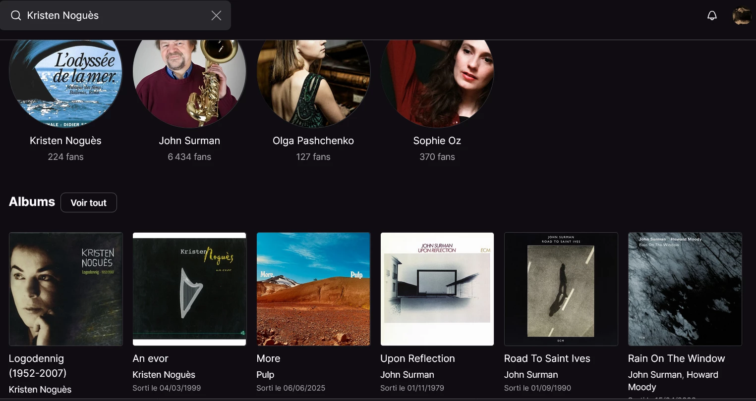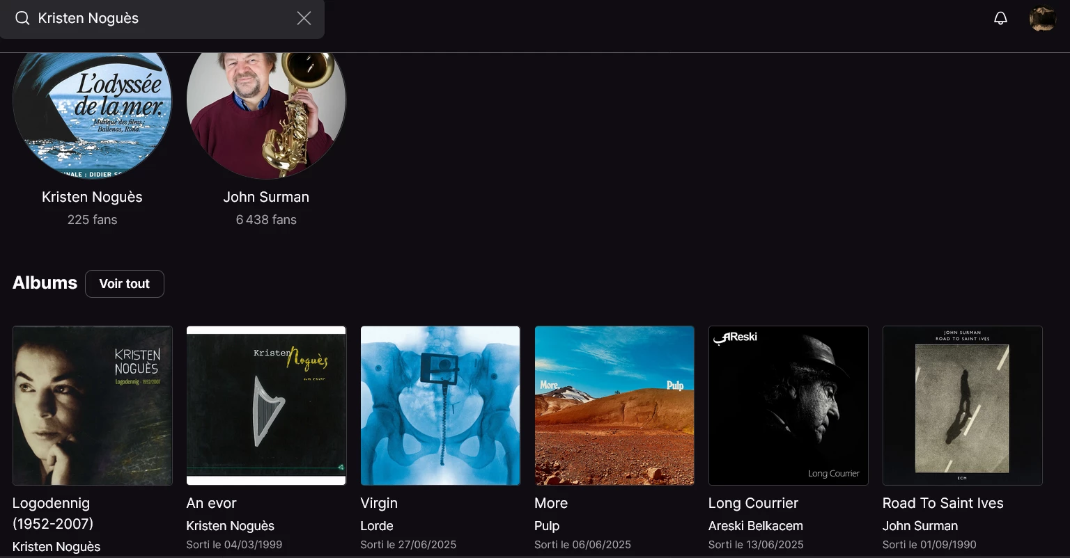 Les deux autres artistes qui sortaient de je-ne-sais-où ont disparu, mais il y a en revanche deux autres albums de plus sans aucun rapport avec ma requête qui apparaissent dans le haut de la liste des albums trouvés (les nouveaux albums de Lorde et d’Areski Belkacem, en plus de celui Pulp, et plus loin dans la liste au milieu de tous les albums de John Surman il y a aussi le nouvel album de Yamê), qui ont pour seul et unique point commun d’être aussi sortis au mois de juin 2025, comme l’album Diriaou de Kristen Noguès et John Surman… ça fait quand même un peu mince pour estimer que le rapprochement est valable, non ?