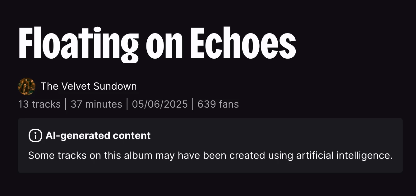 Cela fait des mois que The Velvet Sundown ou autres ont été signalés comme IA et rien n'a été fait, ni pour le préciser sur leur page au minimum, ni pour bannir ce genre d'escroquerie.