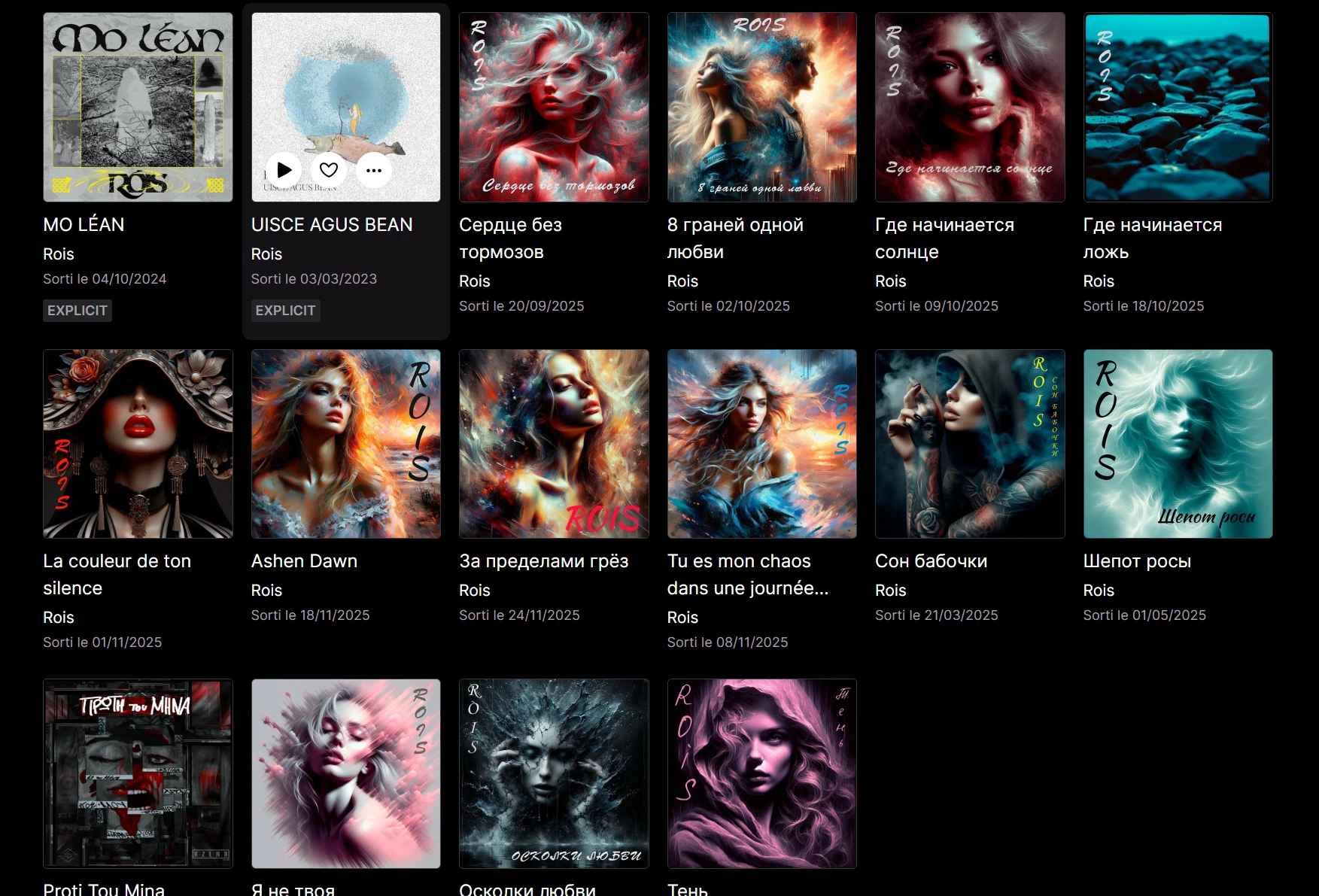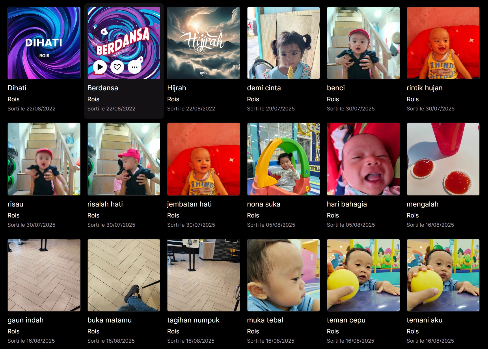 En cliquant sur la page artiste, je tombe sur quelque chose qui n’a plus grand-chose à voir avec ce que montre Arte : pochettes à base d’images générées par IA, titres en russe, en indonésien, photos de bébés, etc. Bref, une page complètement polluée et manifestement partagée par plusieurs artistes qui s’appellent “Rois”, dont certains ont l’air de pousser de la musique générée automatiquement: