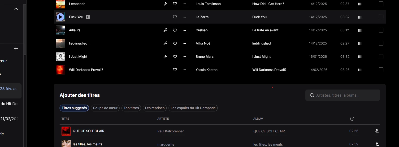 Bonjour, lorsque je me connecte à mes playlist apparait juste en dessous une fenêtre nommée “ajouter des titres” ; je ne veux pas voir cette fenêtre apparaitre de façon systématique à la suite de mes playlists, avant ça ne me le faisait pas, je ne comprends pas trop pourquoi l’affichage se fait ainsi maintenant… ???