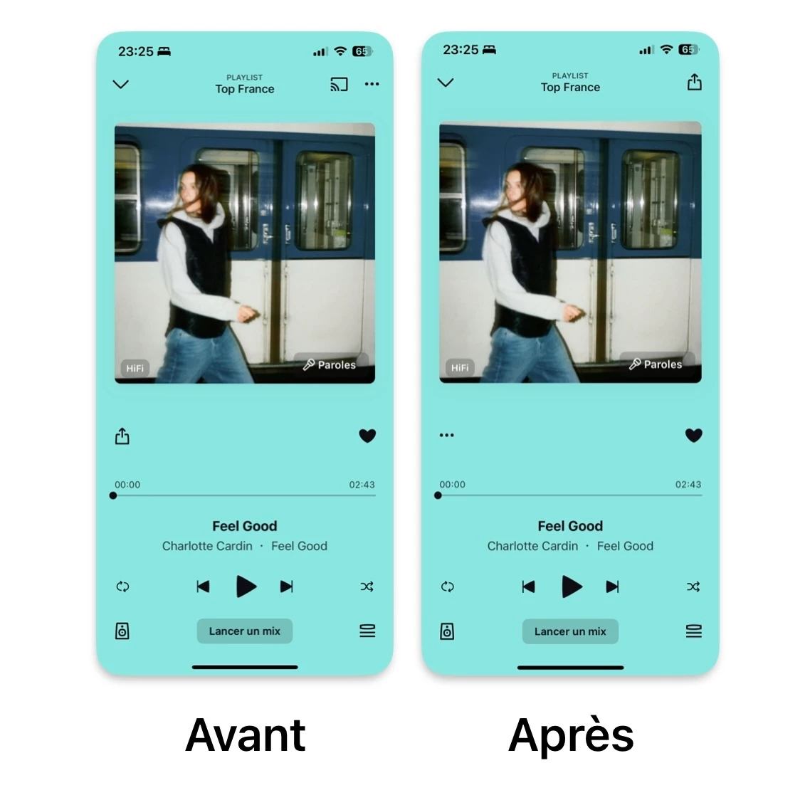 Je voulais juste vous faire un retour concernant la dernière mise à jour de l’interface du lecteur. Avant, les trois petits points (menu options) étaient affichés en bas au centre de l’écran, ce qui était beaucoup plus pratique et visuellement équilibré. Maintenant, l’espace est vide et les options sont en haut, ce qui rend l’interface moins intuitive et agréable.