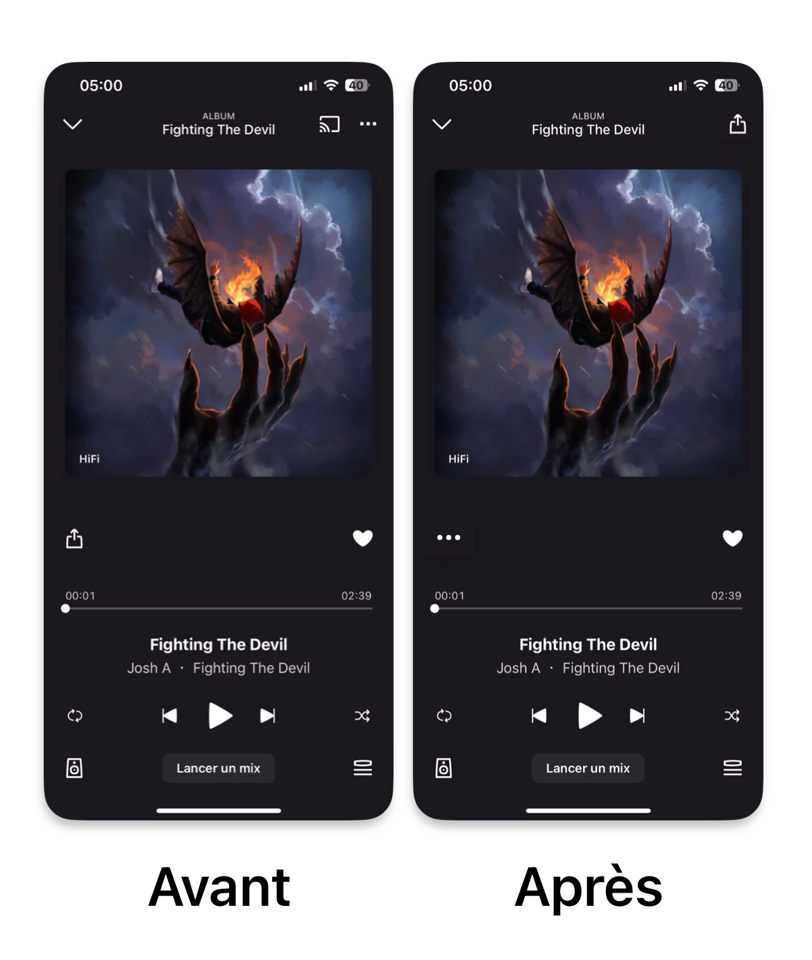 • Le bouton “…”, désormais en haut à droite, contient de nombreuses actions utiles (ajout à playlist, page album, mise en pause, etc.). Il serait plus pertinent de le remettre à un emplacement plus accessible, en l’échangeant avec le bouton “Partager”, qui est déjà accessible via ce même menu.