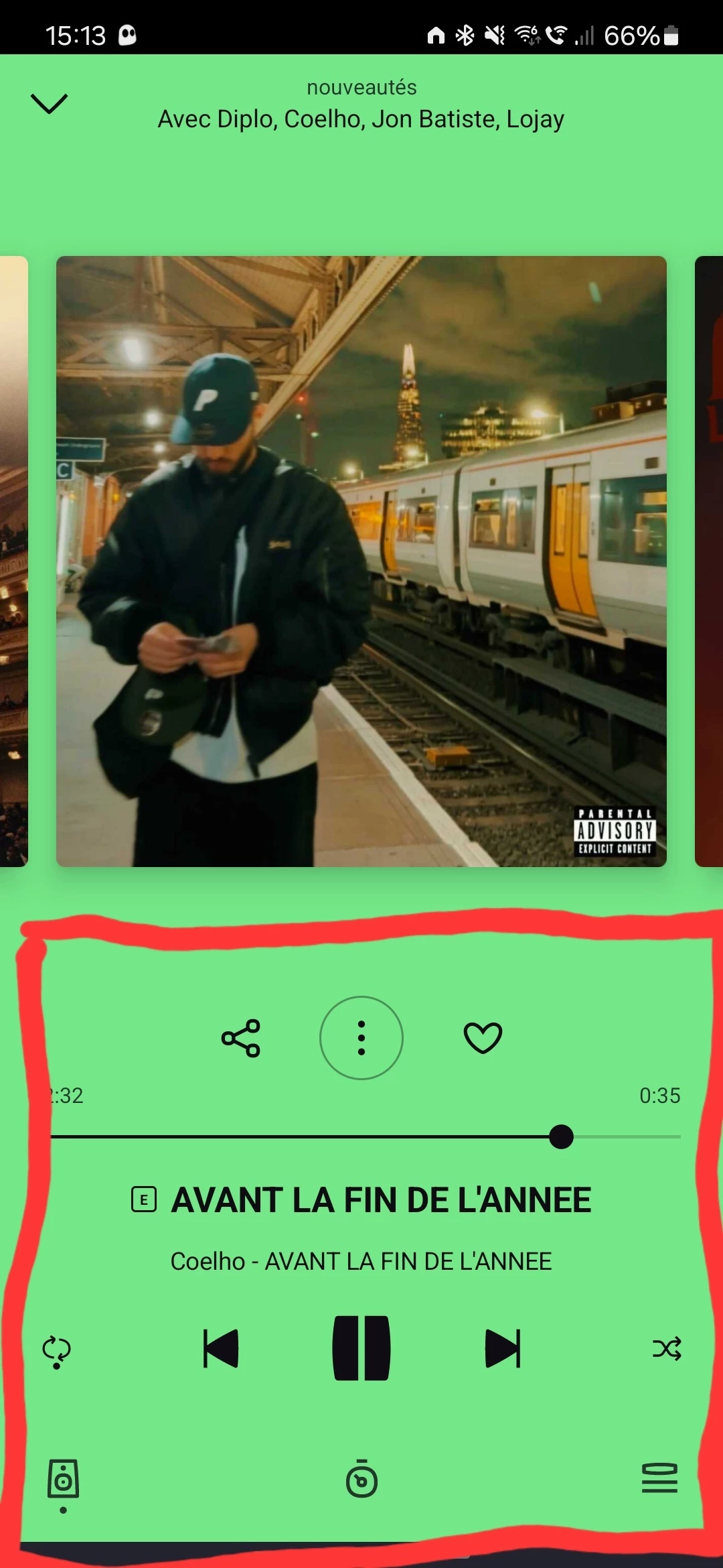 Pour réduire cette fenêtre, il faut faire glisser le doigt du haut vers le bas dans la zone rouge indiquée ci-dessus. Cependant, je trouve que cette zone est trop petite et des erreurs de manipulation arrivent régulièrement comme par exemple " bouger le curseur d'écoute ".