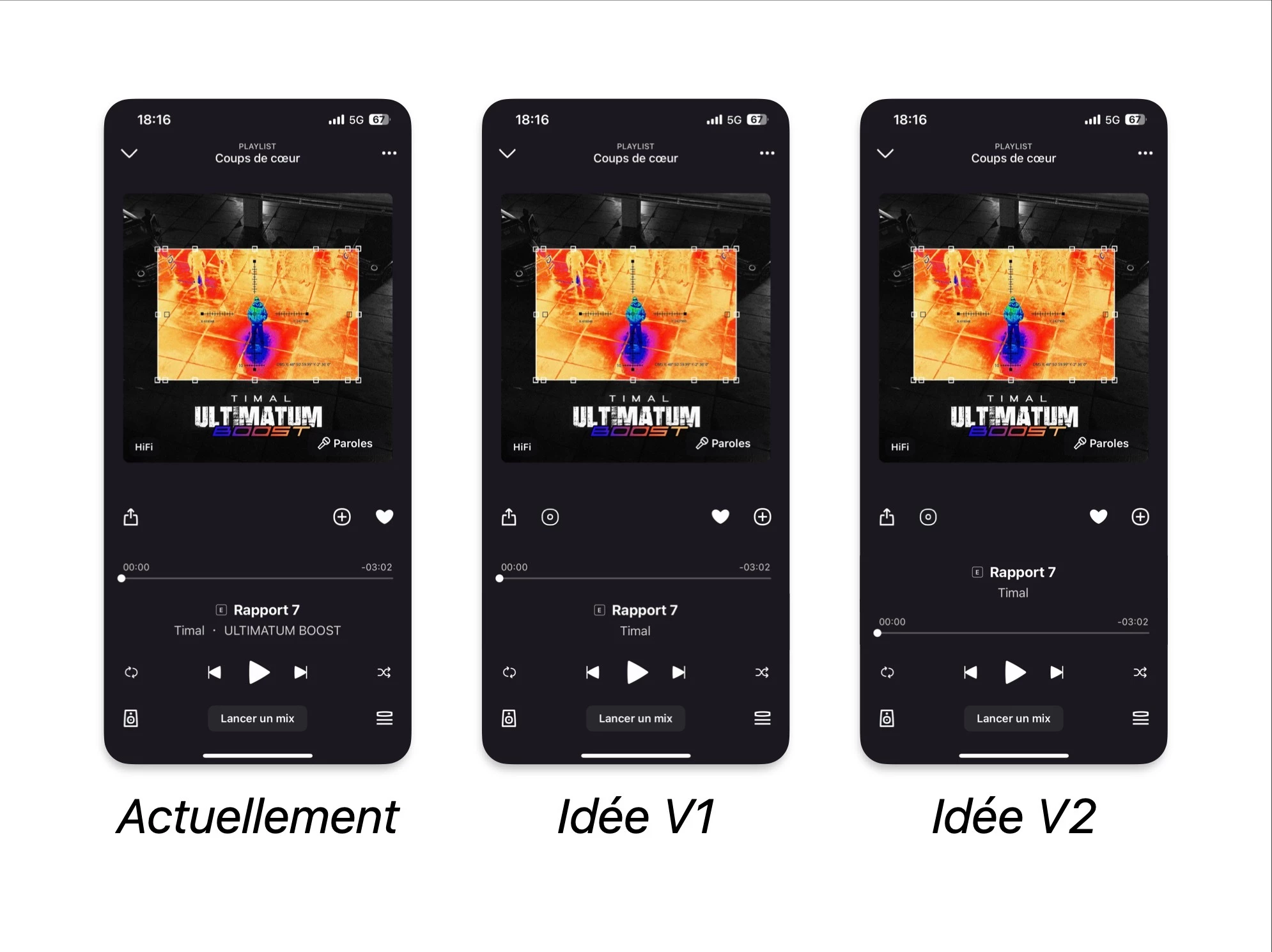 Pour aller plus loin dans cette logique, je propose d’ajouter une icĂŽne 💿 permettant d’ouvrir directement la page de l’album du morceau en cours. Aujourd’hui, il faut toucher les (...) en haut Ă  droite, puis choisir “Page album” — cela fait 2 clics pour une action pourtant frĂ©quente.