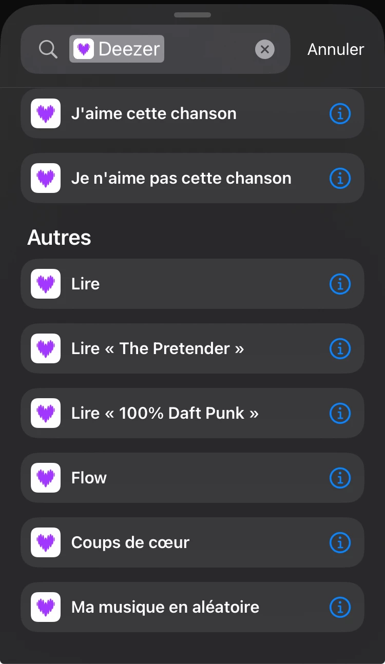Chers amis, enfin l’heure est venue ! Les raccourcis font leur retour (enfin du moins sur mon iPhoneSE iOS 18.4, Deezer 10.37.1.1) !