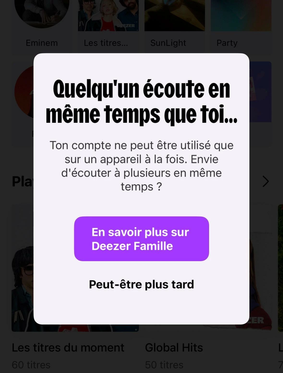 Nous possédons un compte deezer duo mais depuis quelques temps impossible d’écouter de la musique sur 2 appareils en simultané. J’ai bien vérifié et nous utilisons chacun un profil différent. J’ai essayé de passer le deuxième profil en compte indépendant mais ça ne règle pas le problème. Je vous joint une photo du message qui s’affiche lorsque l’on essaye d’écouter en même temps.