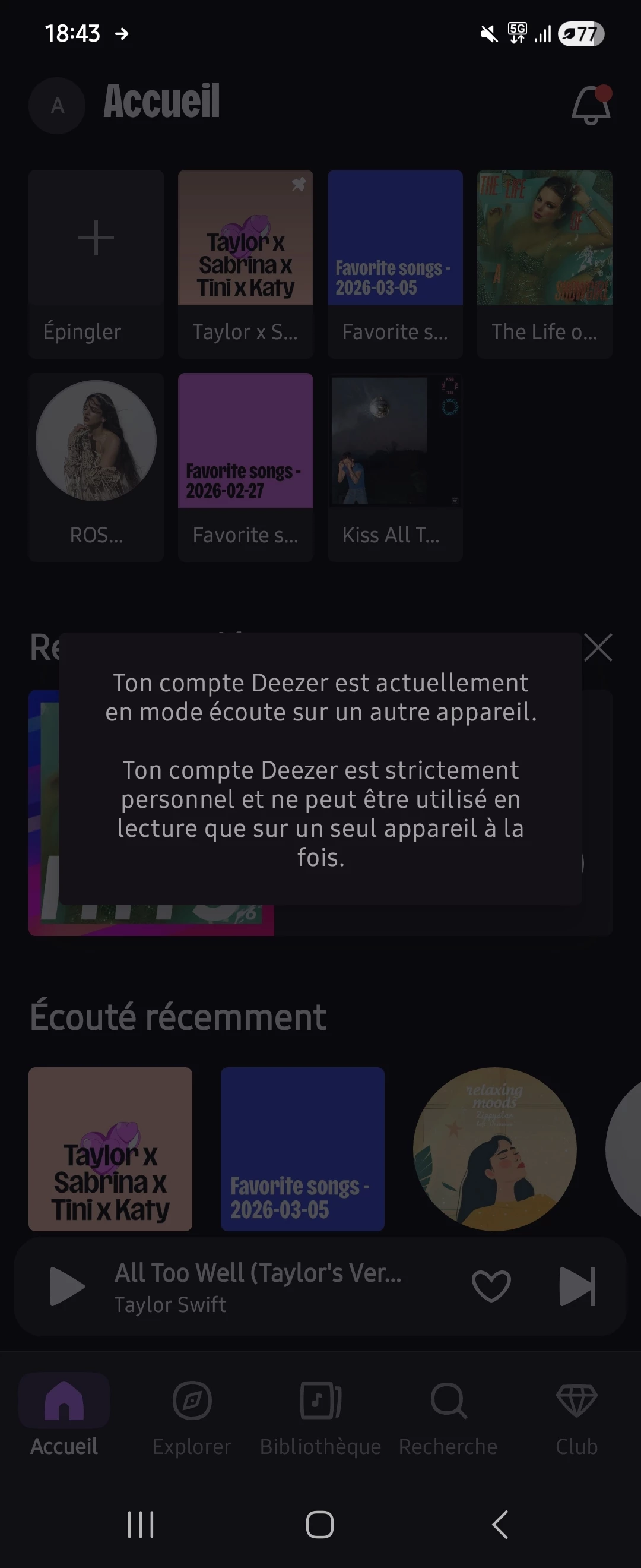 Je viens d'avoir 2 fois un message disant que je peux pas ecouter ma musique sur 2 compte seulement je n'ai jamais utilisé un autre compte que celui que j'ai et je n'ai jamais partagé mes coordonnées a autrui. J'ai un samsung zflip 6 et c'est quand je ferme le téléphone que ça arrive.