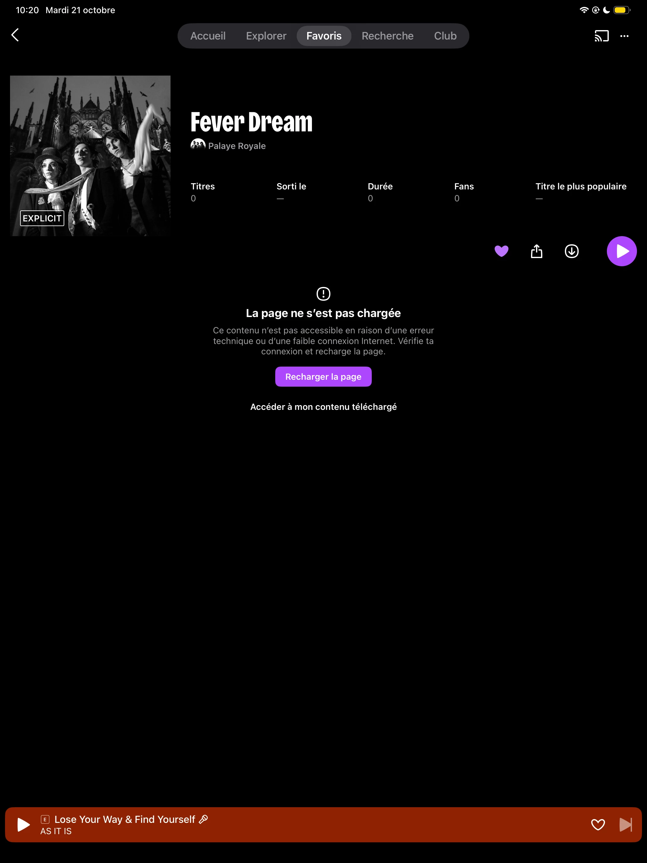 je suis en lien avec le support malheureusement pour les gros compte quand tu as beaucoup d albums en favoris cela arrive ou l album disparaît ( plus de titres invisible ) alors la seule solution ou tu telecharges ou malheureusement faut le remettre en favoris 😭😭😭😭 …………actuellement