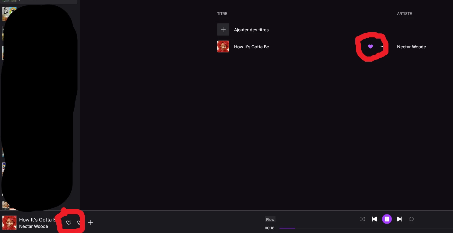 ...Une solution alternative serait que tous les titres ajoutés dans une playlist soient automatiquement cochés “coup de coeur”. Car dans Flow, les titre coup de coeur” sont bien identifiés.