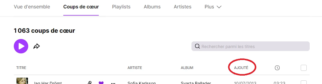 En effet, toutes les colonnes se trient de la même manière, dans les coups de cœur comme dans toute playlist, ou sur les albums pour les colonnes qui apparaissent dans ce cas. Mais ici, dans les coups de cœur, il est curieux que vous ne voyiez pas “Ajouté”… 🤔