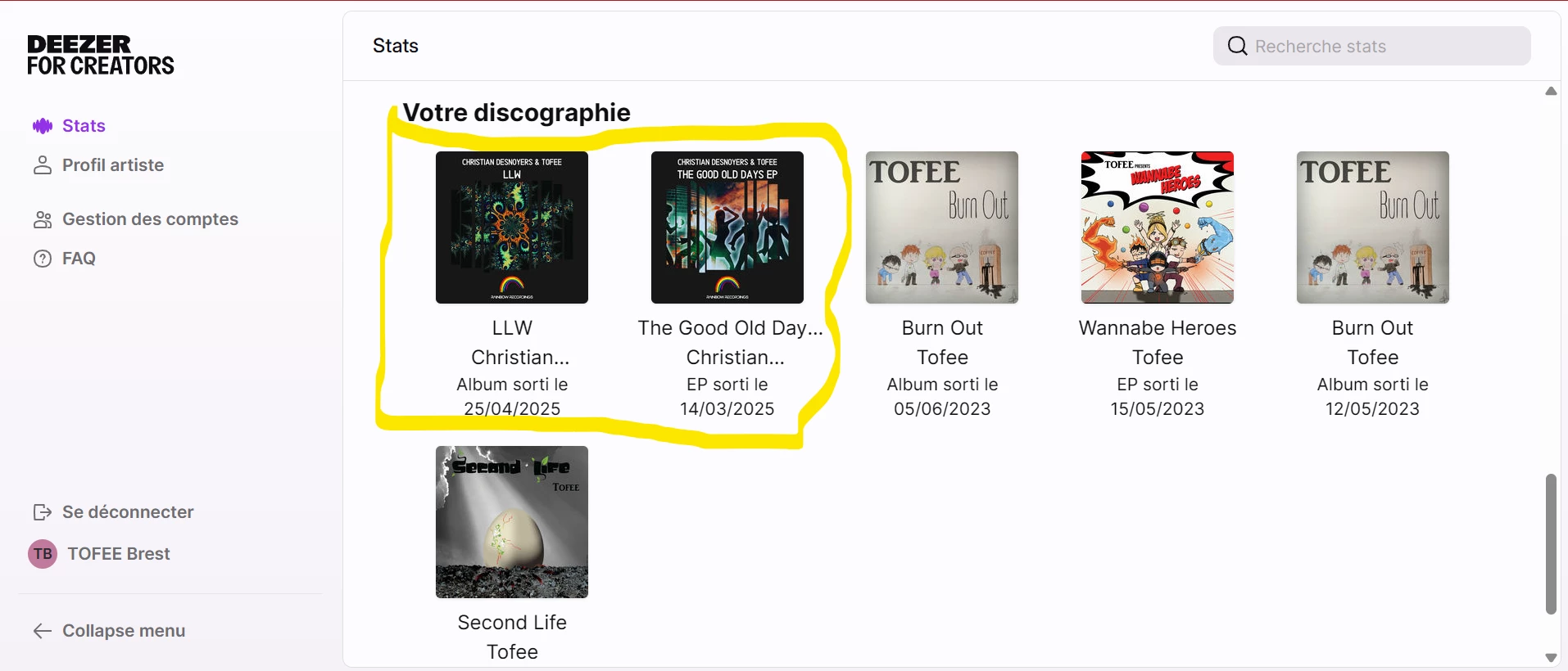Bonjour ​@Tofee, mon système est inaccessible, je t’invite à contacter l’équipe dédiée aux artistes afin qu’ils puissent t’aider > https://creatorsupport.deezer.com/hc/fr-fr