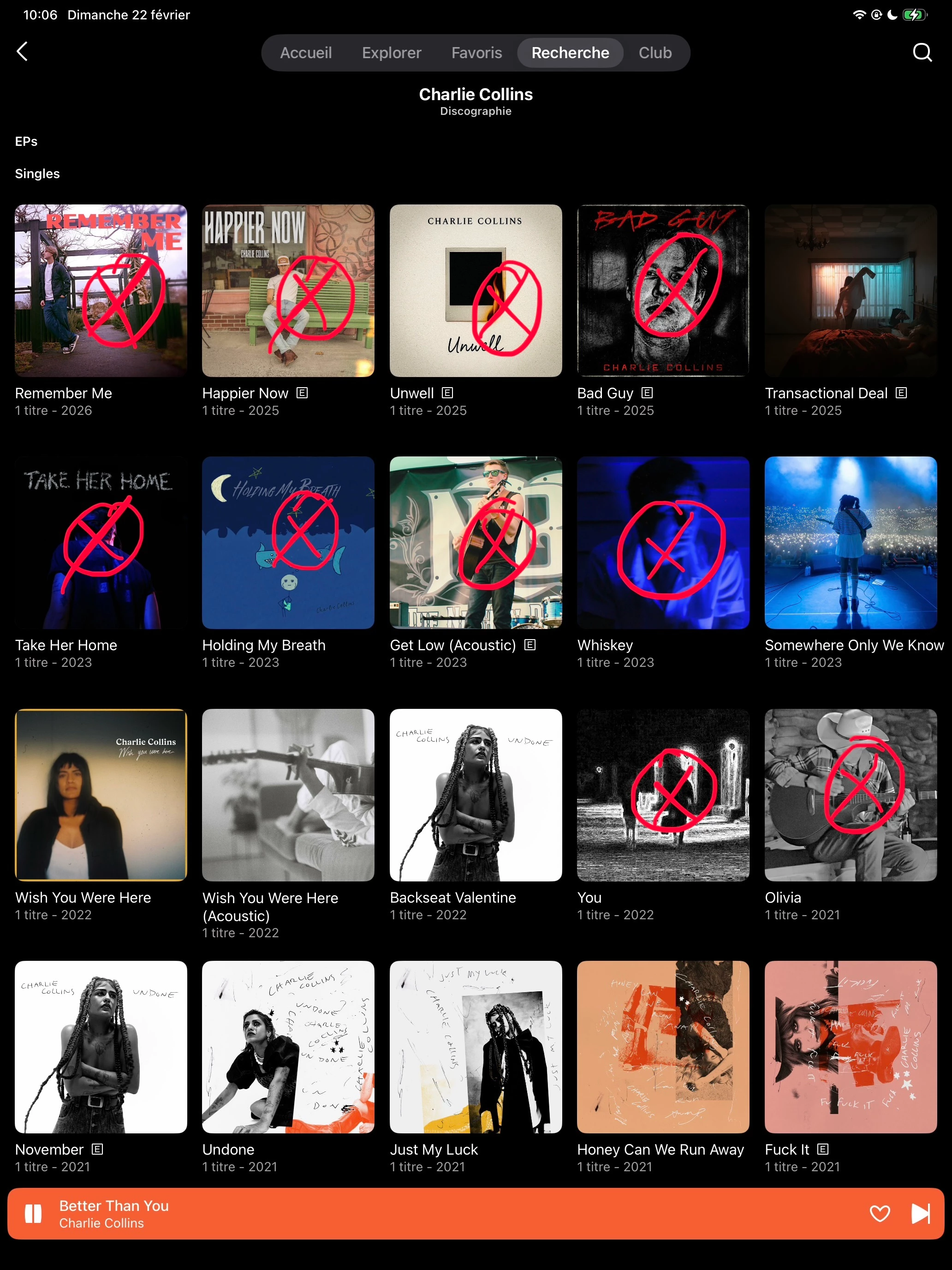 Bonjour je viens de voir que la discographie de Charlie Collins la chanteuse 🙂 vous avez mis un autre artiste qui ne correspond pas à la chanteuse donc j’ai fais une screencapture et j’ai entourer les singles albums qui n appartiennent pas à cette artiste 🙂 pour que vous modifiiez 🙂