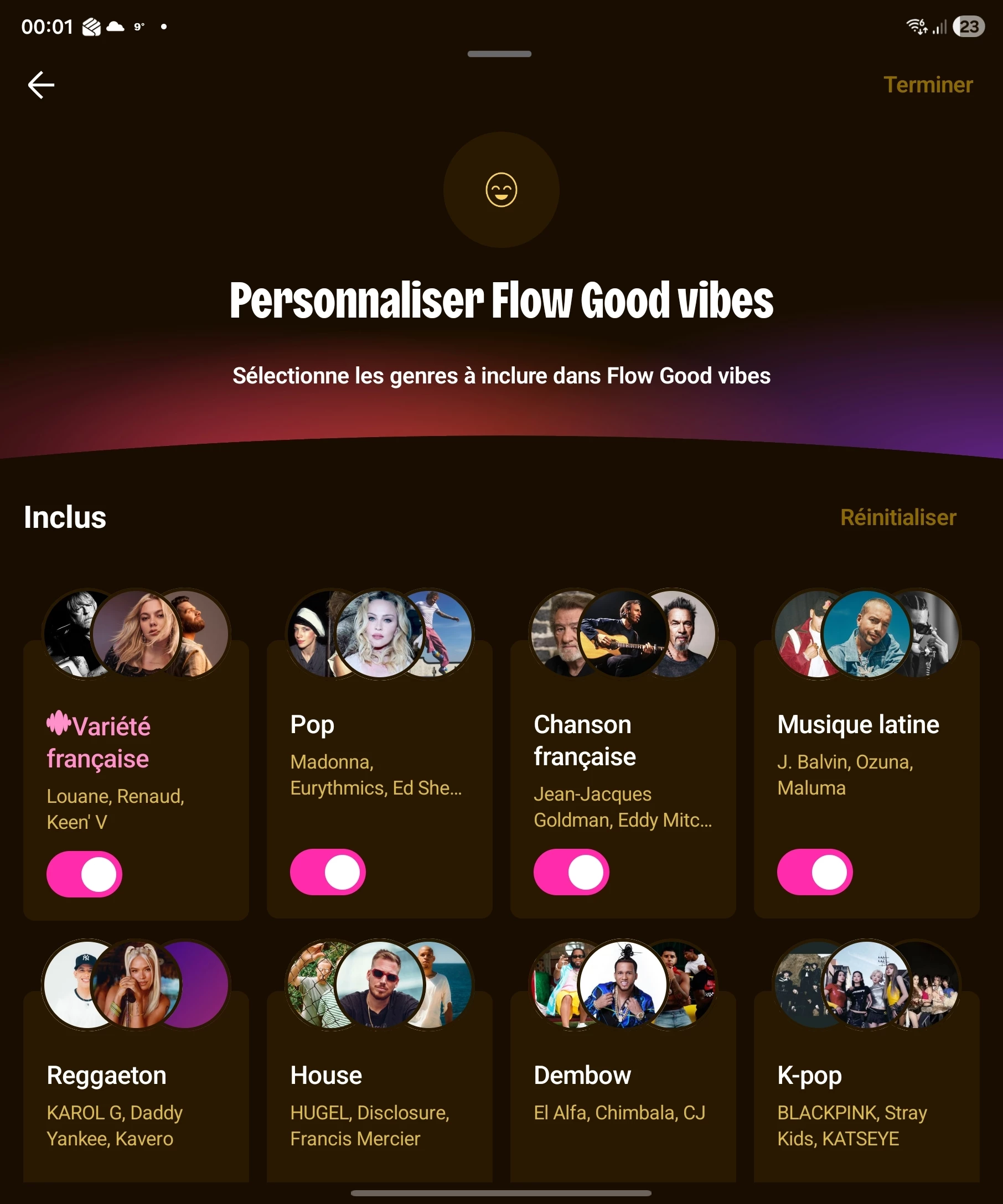 • Ajouter de nouveaux genres pour explorer de nouveaux sons : élargis ton univers musical et laisse Flow te surprendre avec des artistes et styles que tu ne connais pas encore.