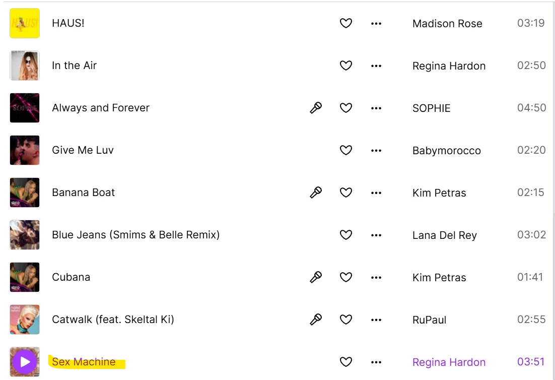 Aujourd’hui j’écoutais une playlist et me suis rendu à ce que ce soit uniquement de la musique recommandée qui joue. Bien souvent, je fini par me tanner parce que Deezer n’a jamais envie de recommander des chansons qu’il sait déjà que j’aime, mais cette fois-ci, non seulement c’était le cas, mais il a voulu me faire réécouter la même chanson “Sex Machine” de Regina Hardon 3 fois en l’espace d’une heure.